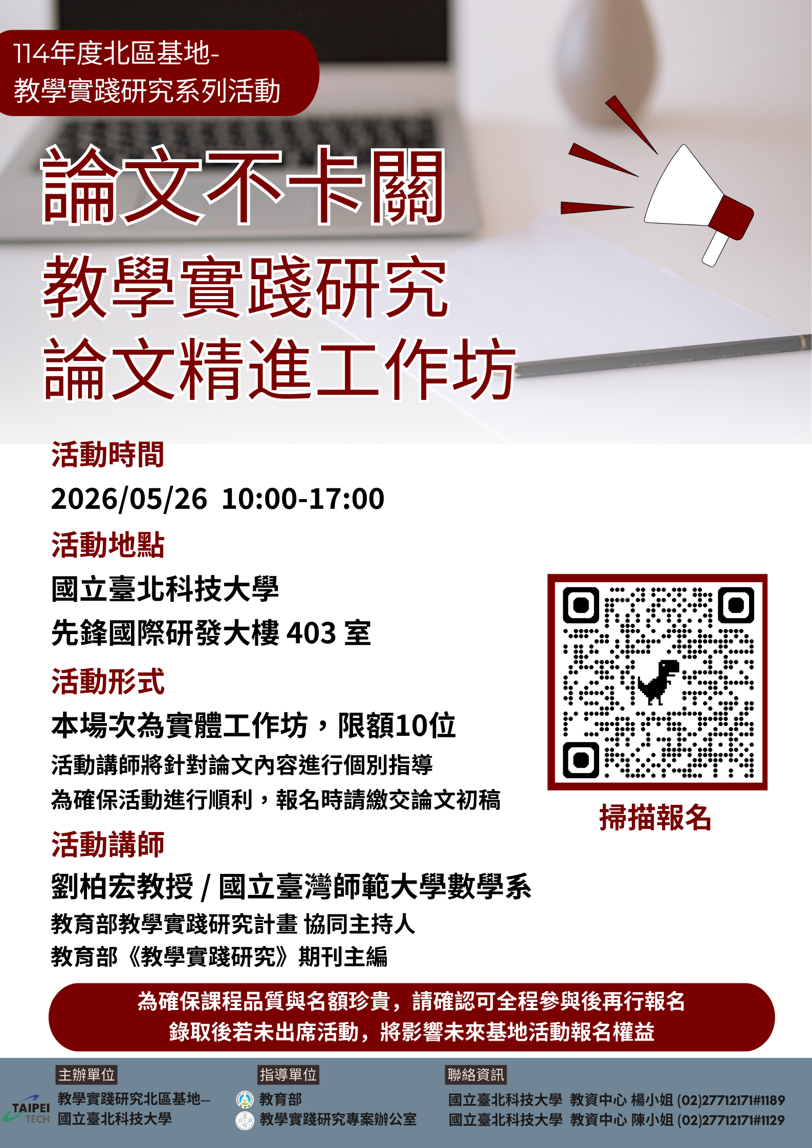 【教學發展中心代發】教學實踐研究計畫北區基地謹訂於115年5月26日辦理教學 實踐研究論文撰寫工作坊,5月12日、5月26日辦理創新教學線上工作坊,歡迎教師踴躍參加。